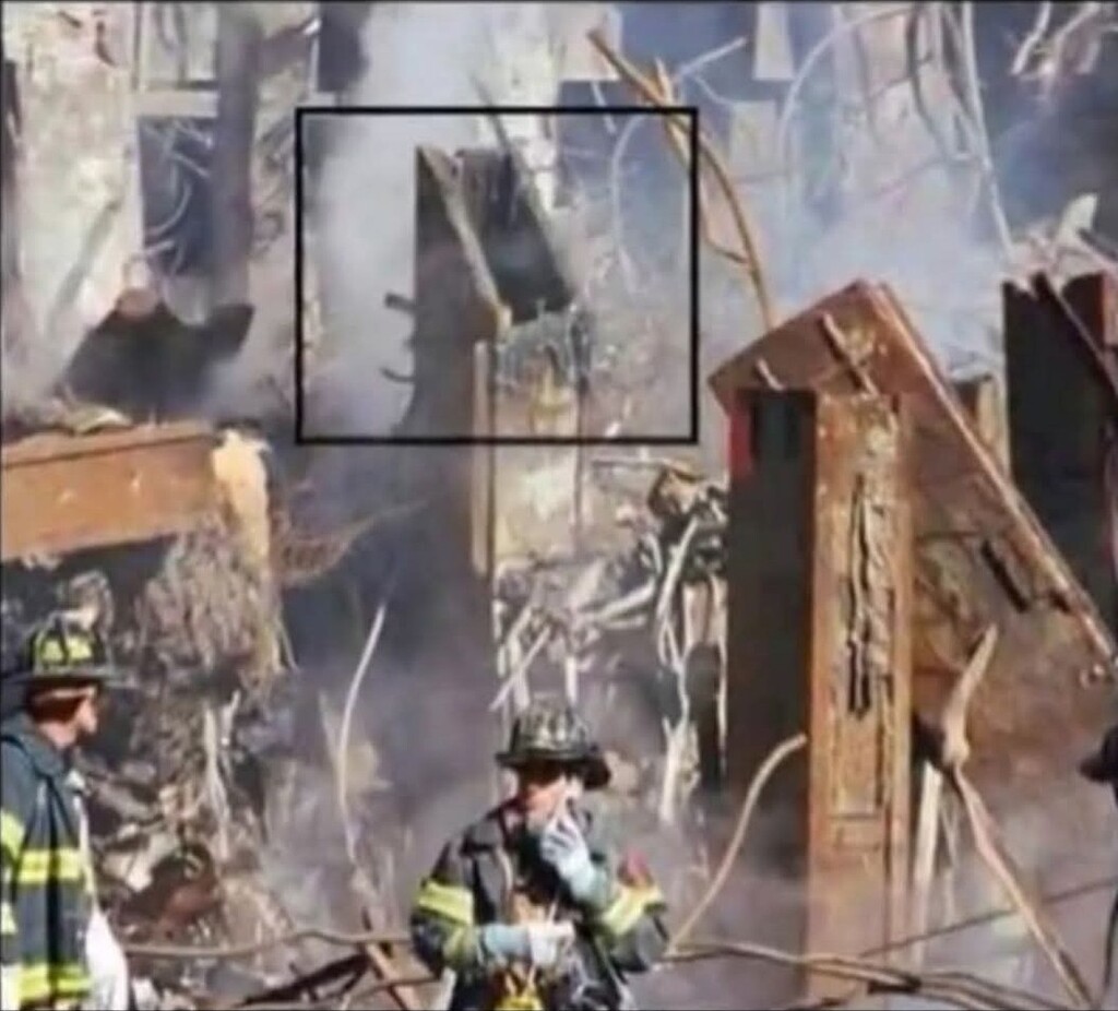 After the towers have fallen and the toxic smoke has cleared the remaining wreckage was in plain view. This photo captures an angled cut with residual melted steel towards the front. This can only happen intentionally with controlled demolition methods using Thermite which burns at roughly 5,000F. Enough to melt this steel box beam in a few seconds.